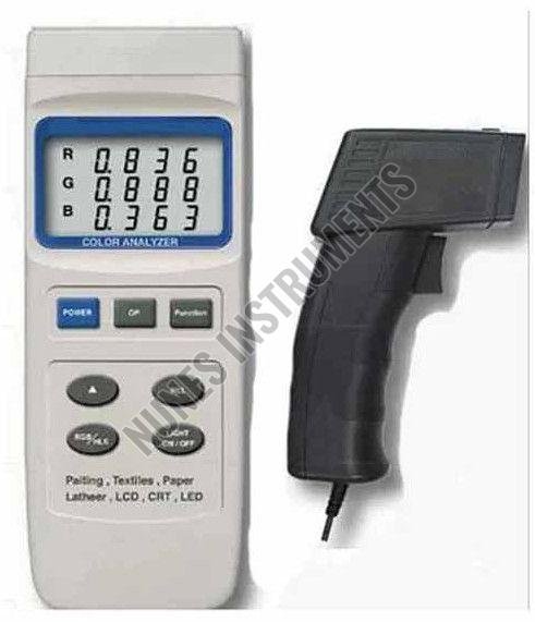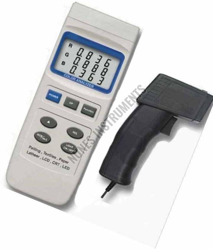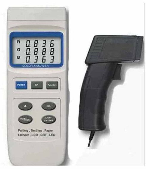 Digital color analyzer/comparator is indespensible tool for colorcomparison & is portable equipment equipped with external sensor probehaving 45/0 degree color measuring geometry. It uses thespectral analysis method to determine the color of sample,It has user friendly features to get color value (R, G, B or H, S,L) comparision of color value is easy for two measurementmaterials,Built in CAL button for self calibration with white calibrationcard included in kit, Power: 9 V Battery (006P DC) &Dimensions: 203 X 76 X 38 mm.