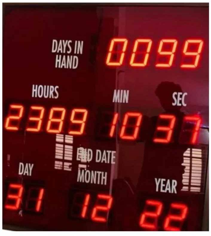 Multi-digit seven-segment LED display for days, hours, minutes, and seconds.